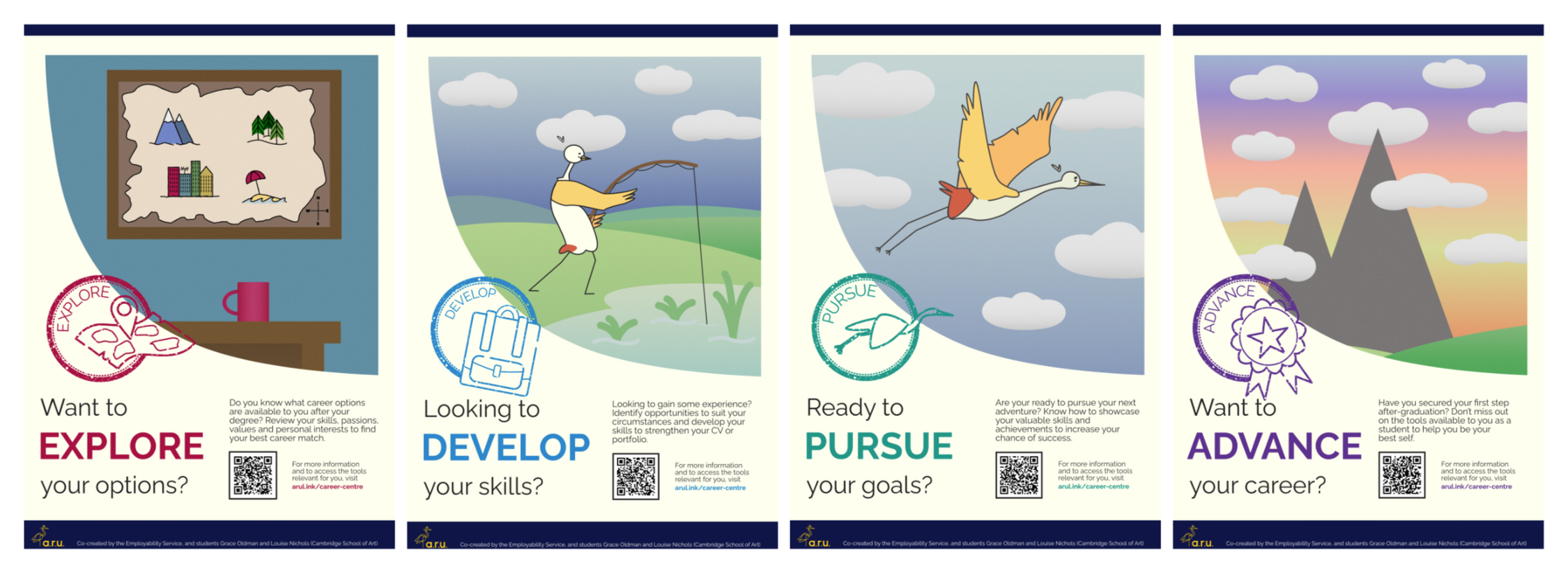 I worked as a graphic designer for the Employability team at Anglia Ruskin University. I designed the stamps, the website and email banners as well as the posters for the career's centre. I worked alongside an animator who produced a short animation for the team, which I helped create backgrounds for.